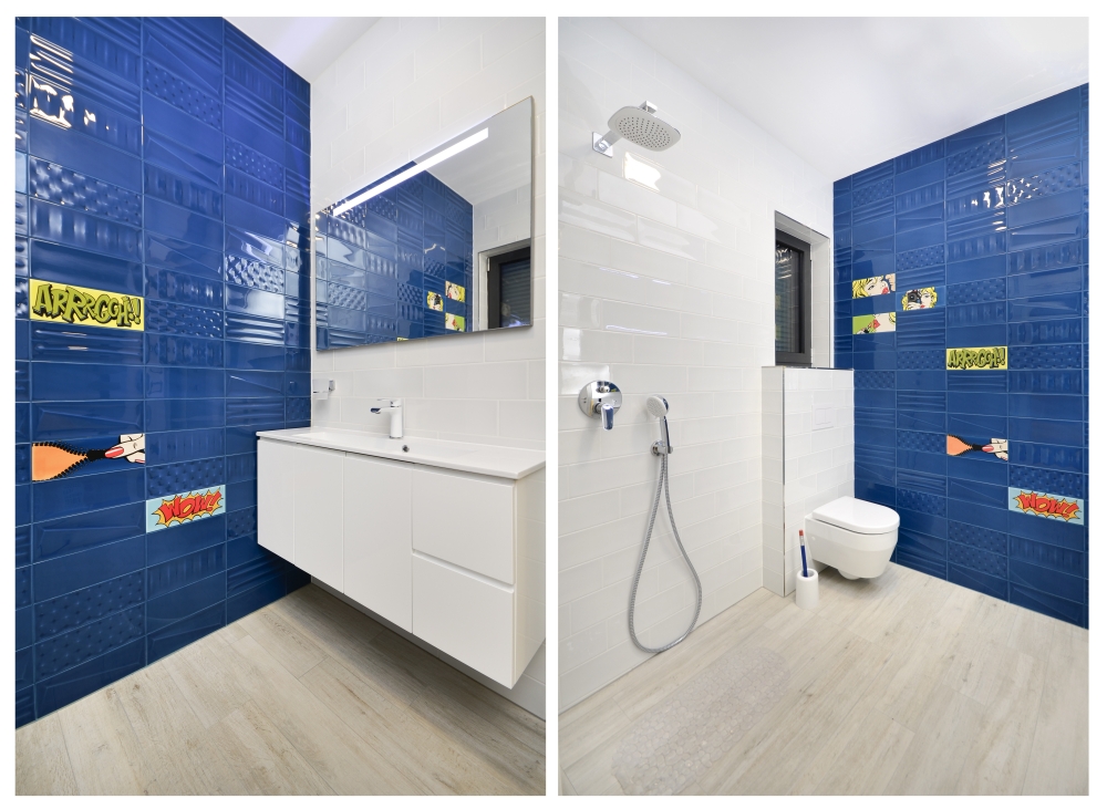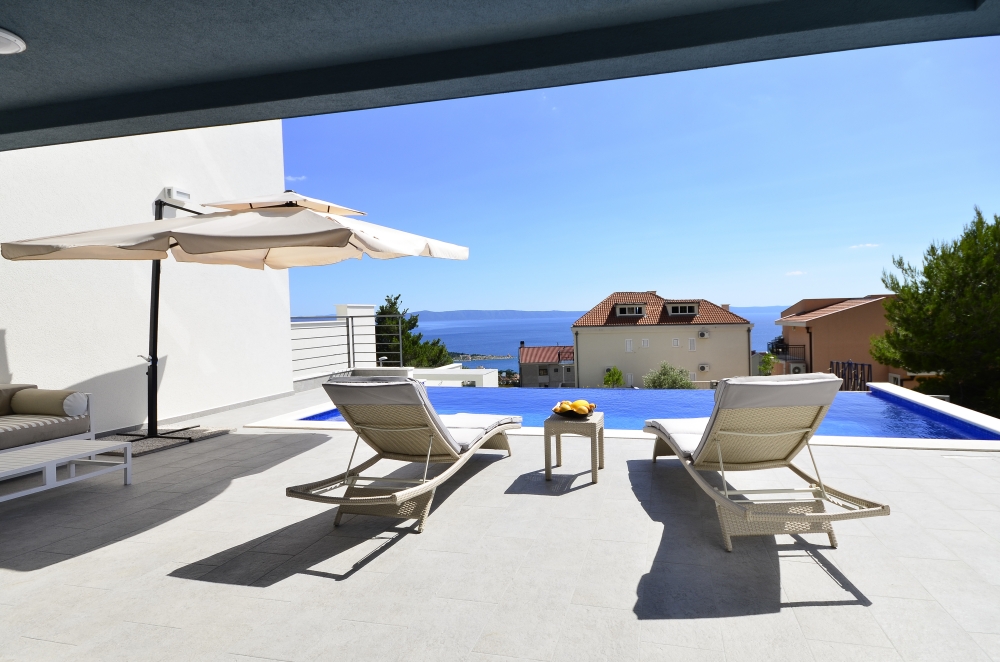 The first floor features 3 bedrooms each with their own bathrooms. Two rooms have terraces which overlook the stunning Adriatic below and the third bedroom boasts beautiful views of the majestic Biokovo Mountain. All rooms feature queen size beds, two of them are with built-in closets, one with wardrobe and all of them have beautiful bathrooms with luxurious glass showers.