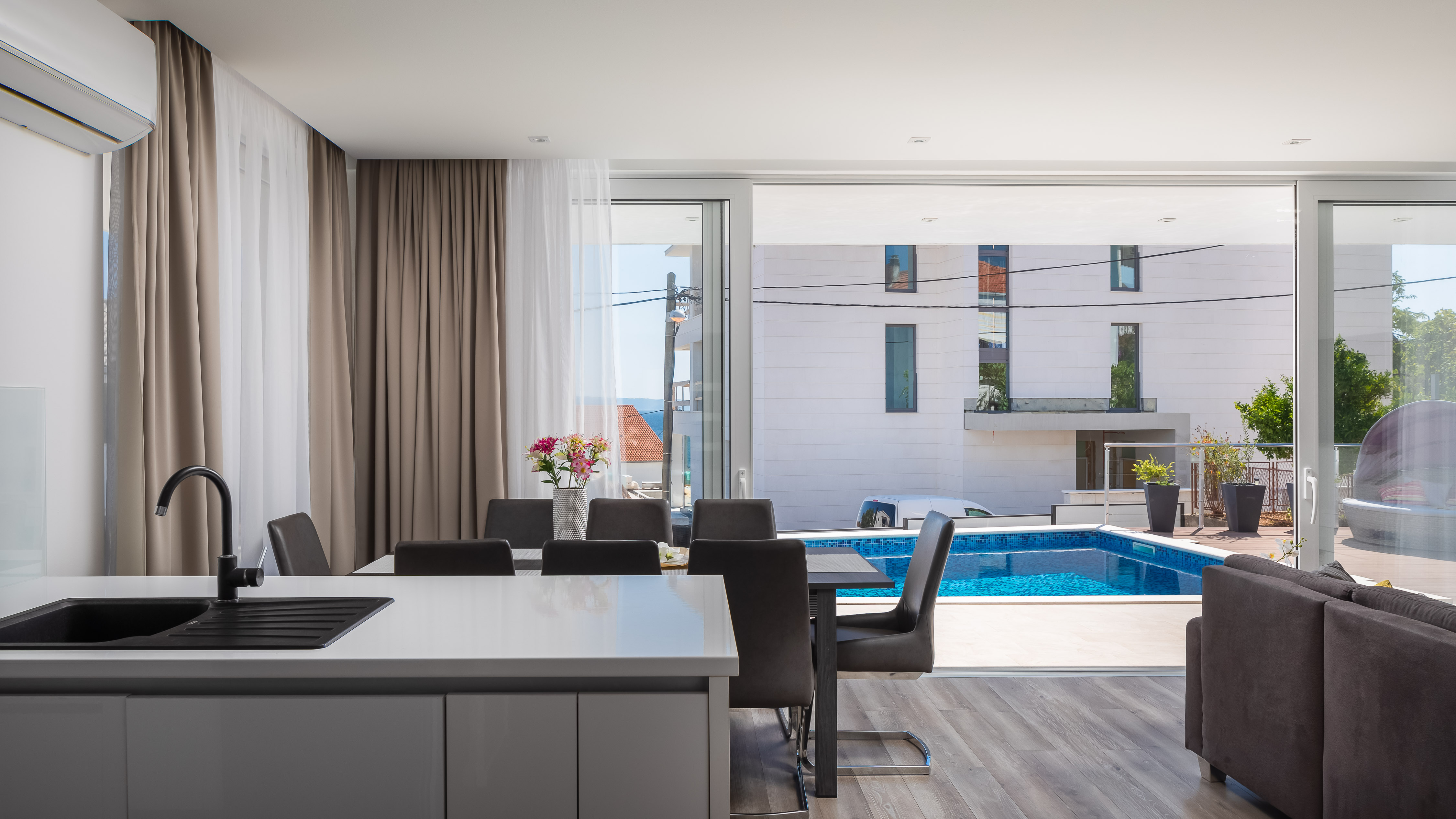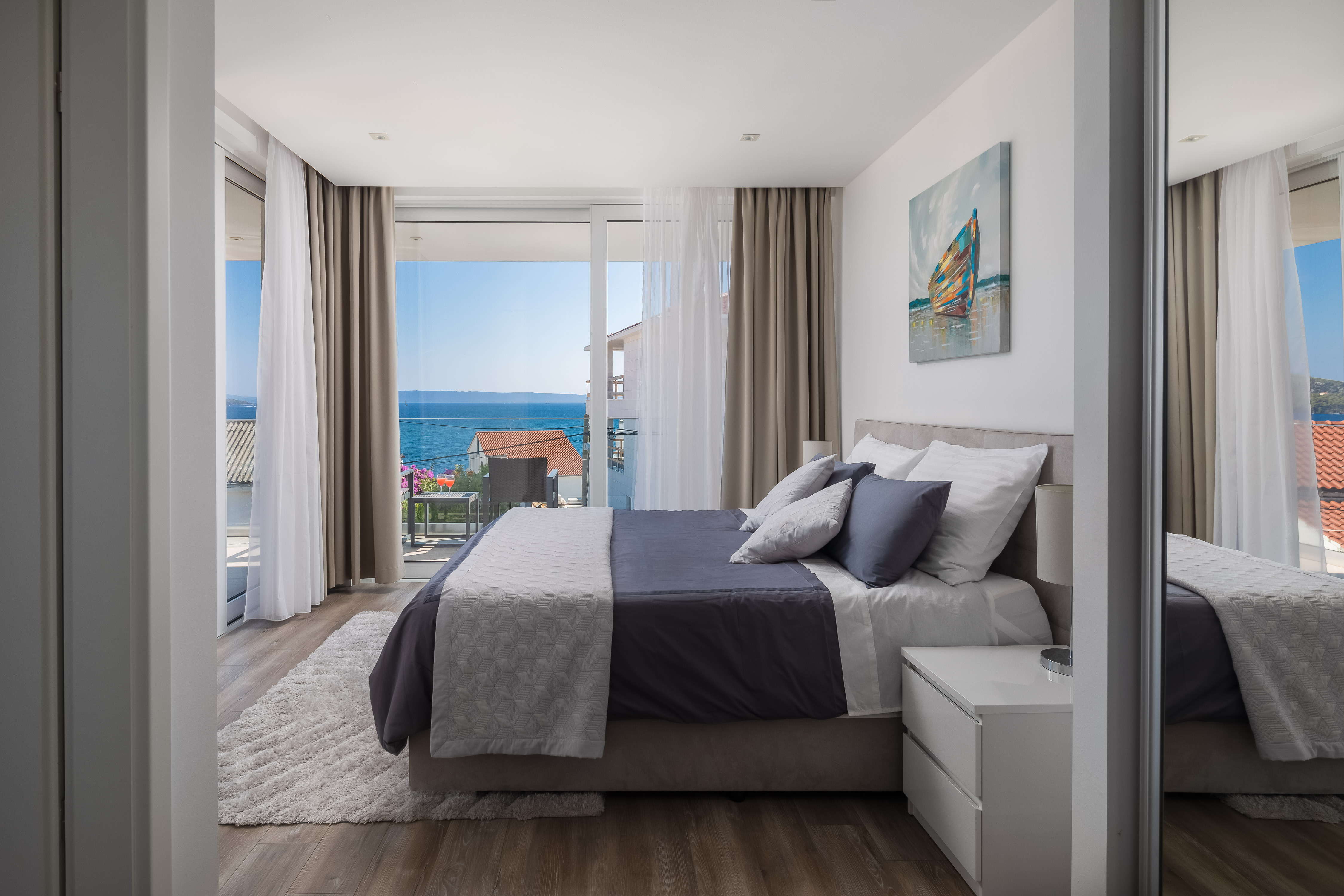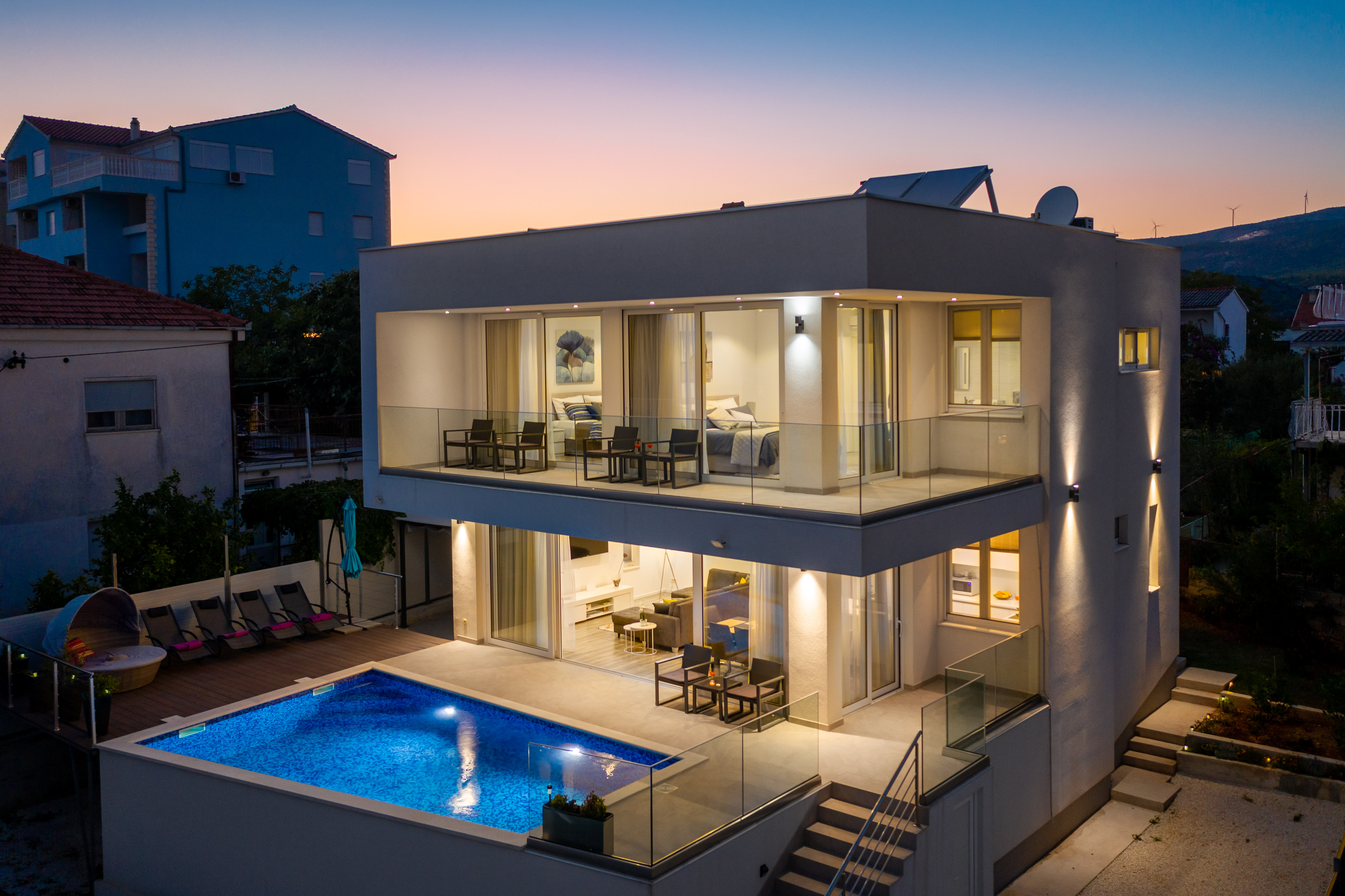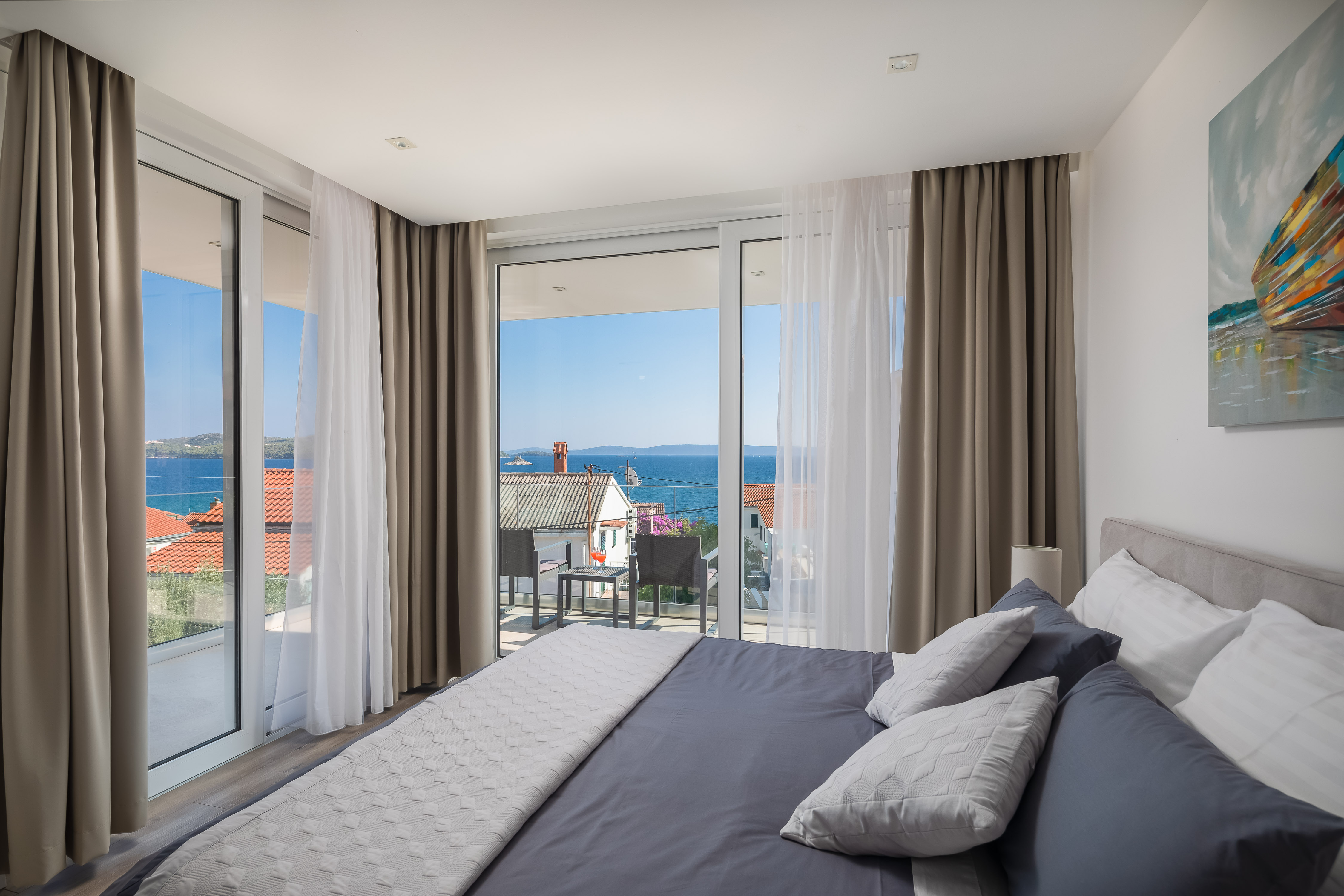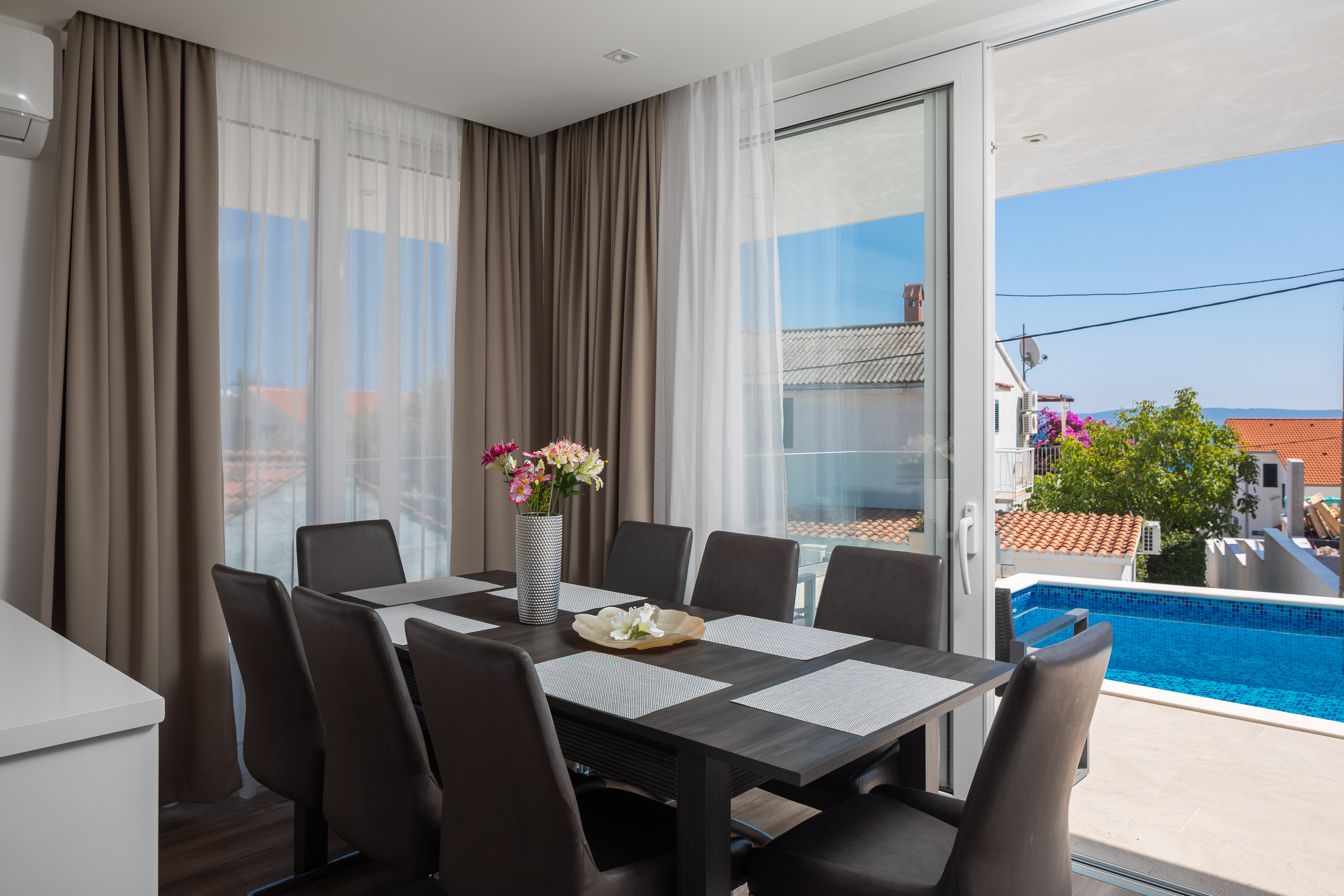Villa Antony is located in a small quiet place Seget-Vranjica, only 5 km from Trogir. The villa is located only 60 m from the beautiful and crystal-clear Adriatic Sea and beaches with a beautiful view of the surrounding islands and the sea. Villa Antony offers luxurious, comfortable 4 rooms, equipped with state-of-the-art equipment and high quality furnishings, 3 bathrooms, a fully equipped kitchen with a dishwasher and an oven and open living room with terrace access. Guests can enjoy meals on the sea-front terrace and garden with a large pool. Guests wishing to travel lightly can make use of towels and linens for an additional supplement. Parking is available. In Seget Vranjica, as well in Trogir surroundings, you will find a great choice of sports activities. There is a major advantage of the Villa Z&Z: an excellent transport link with the Split airport only 11 km away, Šibenik 55 km, the capital of the region Split 33 km away, NP Krka 70 away, etc.