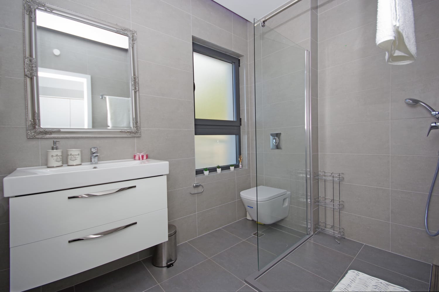 Villa Andy consists of a total of three bedrooms. Each room has its own bathroom. On the ground floor there is a spacious, modern living room with an open kitchen. The living room opens onto the terrace and pool. Outside is a terrace with an outdoor heated pool (2.5 x 8.5 m) and a beautiful view of the sea and the nearby islands, Brac and Hvar. There is also an outdoor shower, sun loungers and a barbecue.