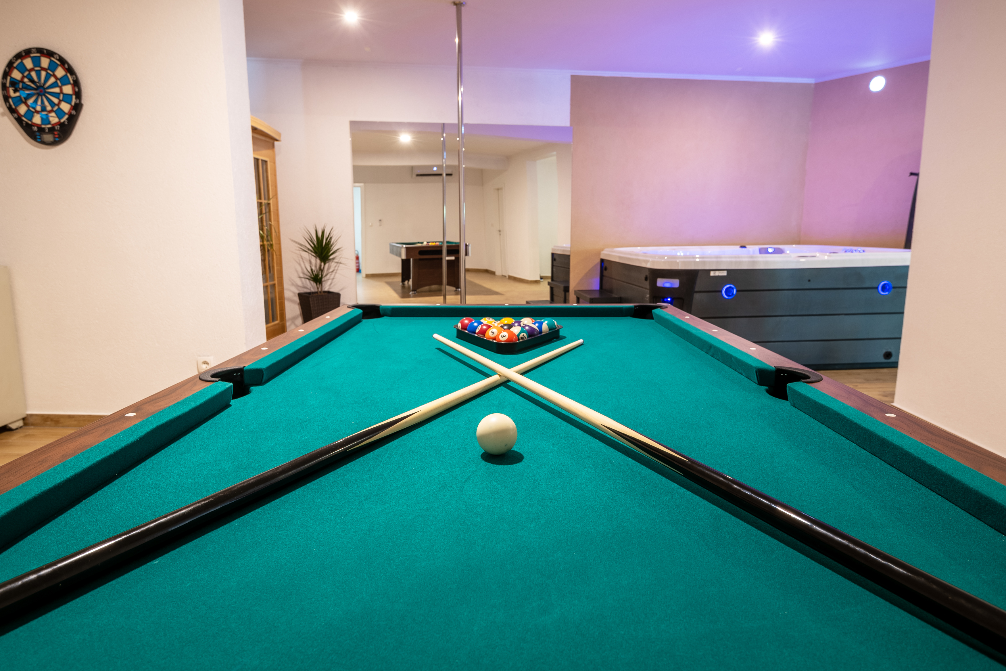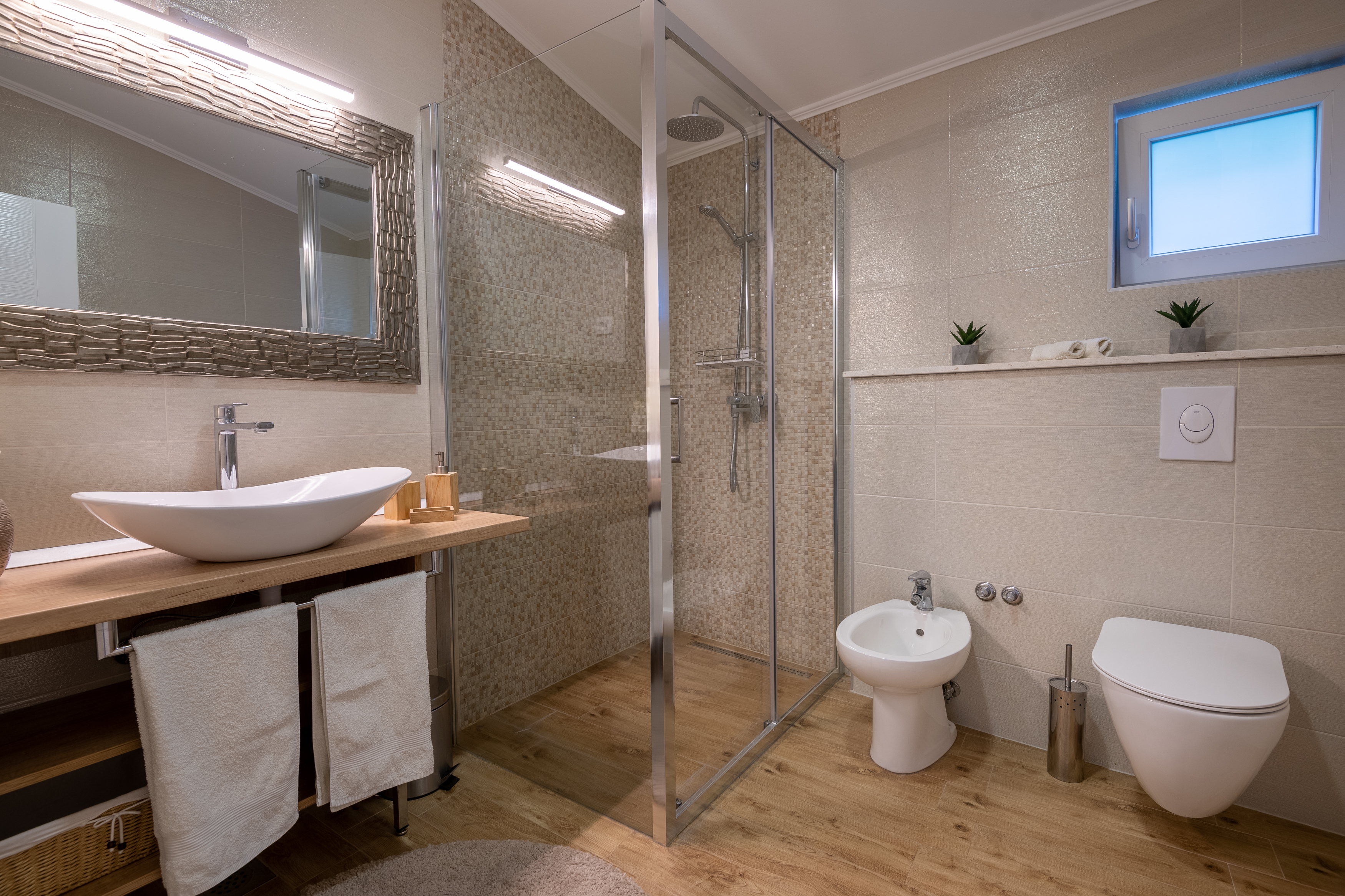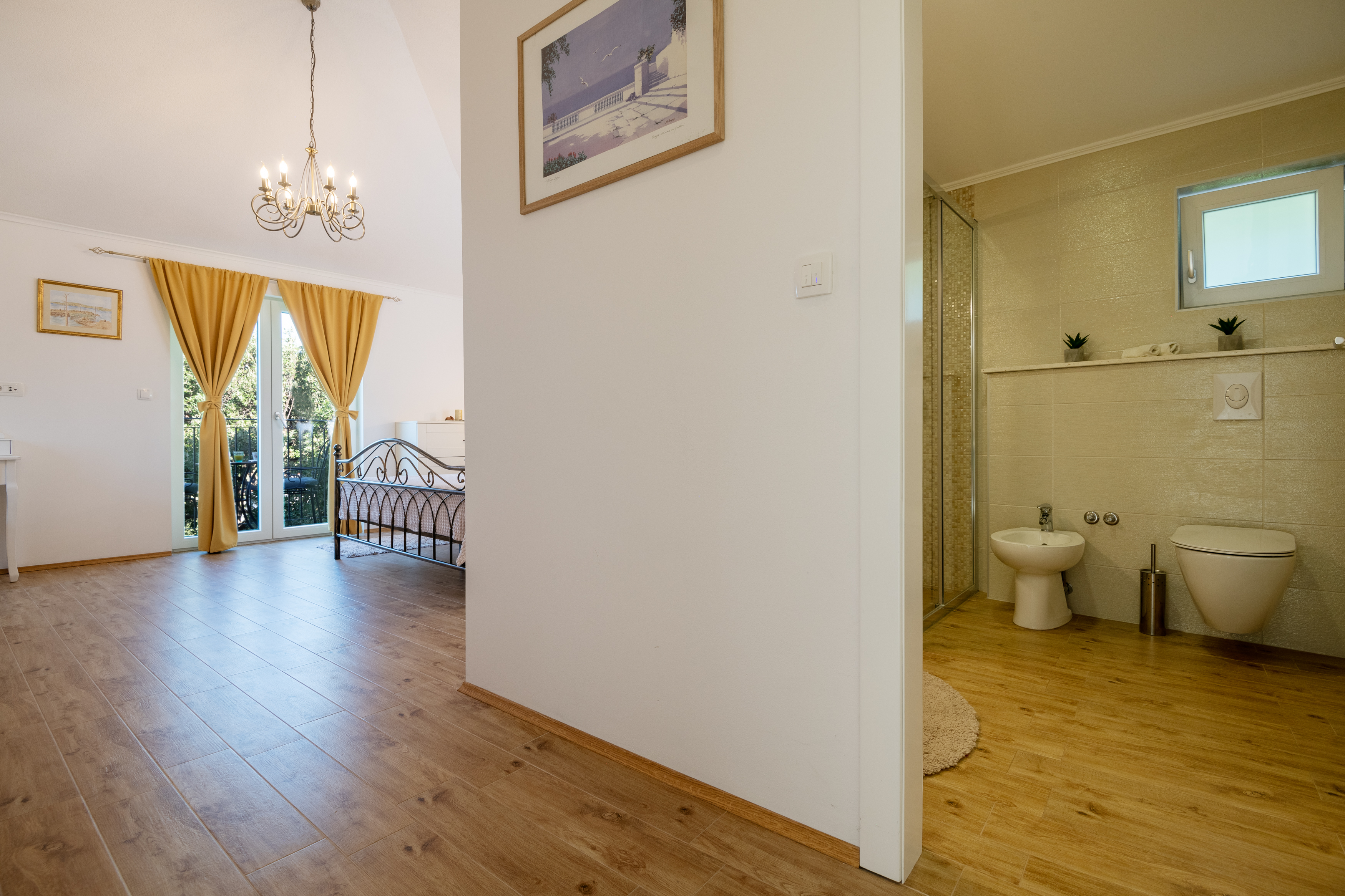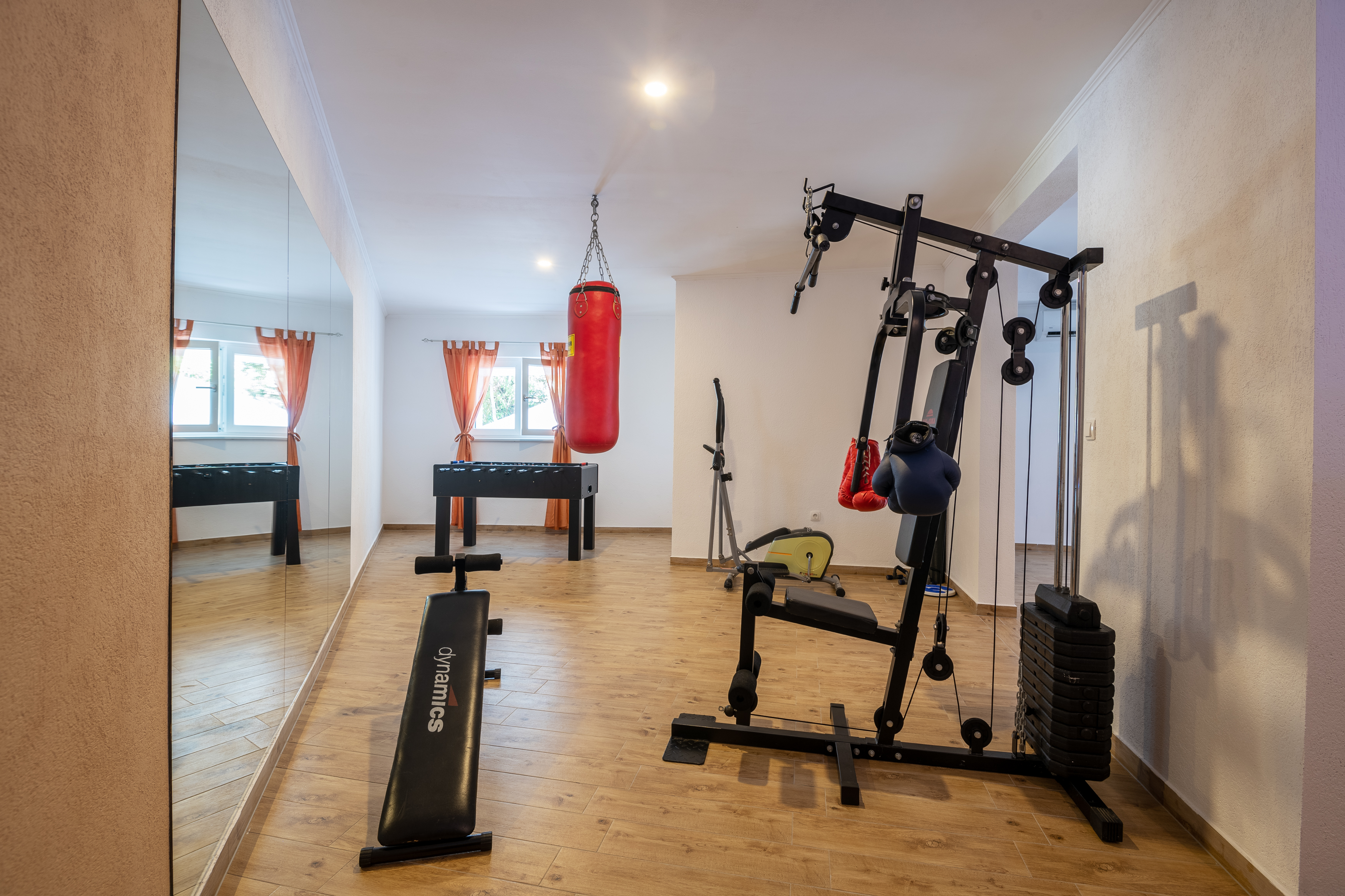 Villa consists of basement, ground floor and first floor. On the ground floor there is a spacious living room,fully equipped kitchen with dining room and bathroom with bath and wasching maching. At the first floor there are two bedrooms with king size beds and bathrooms. Both rooms have southside balconies from which you can enjoy your morning coffee while watching the sunrise. Basement is equipped with fitness room,jacuzzi,sauna room, and room with picado and billiard table.