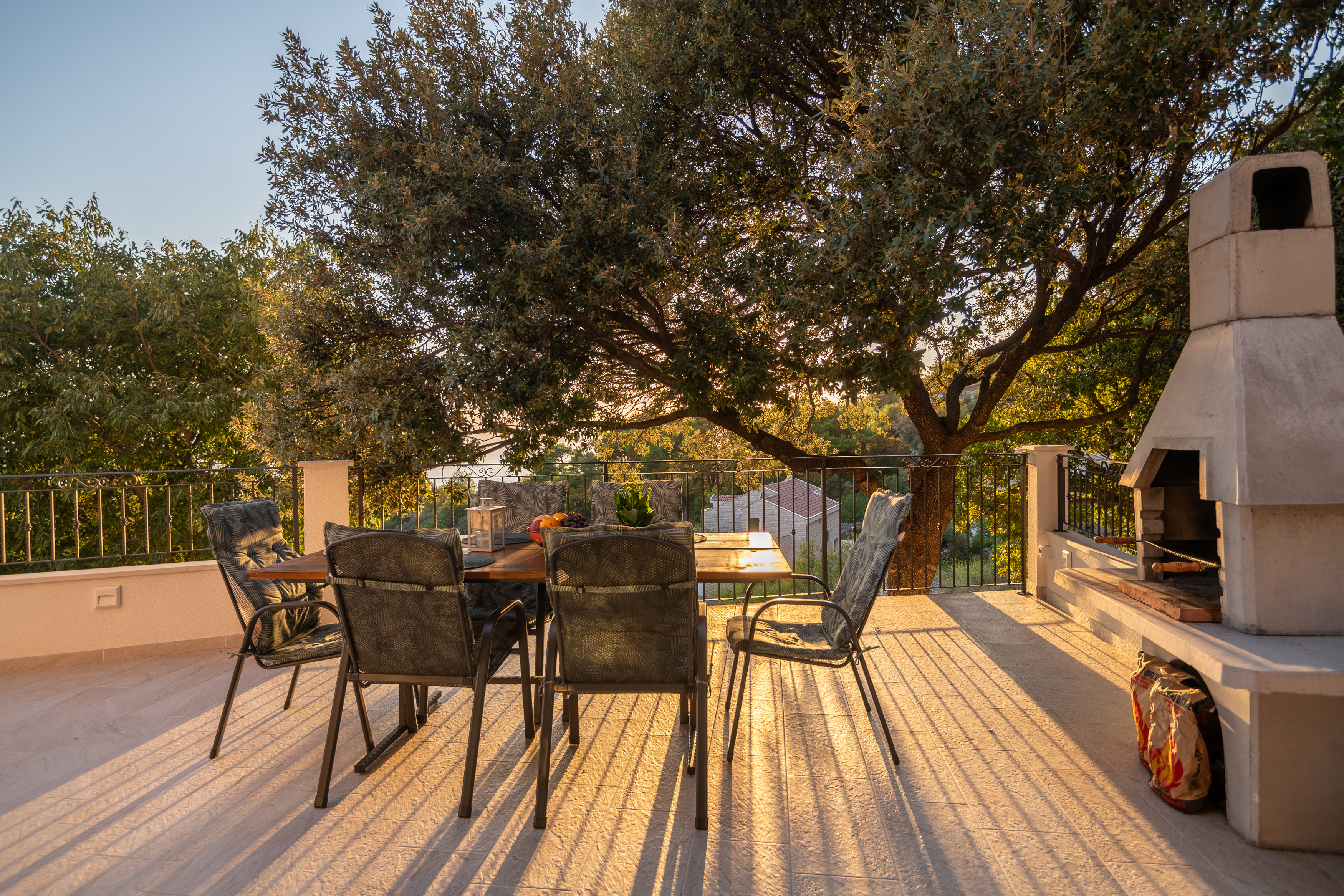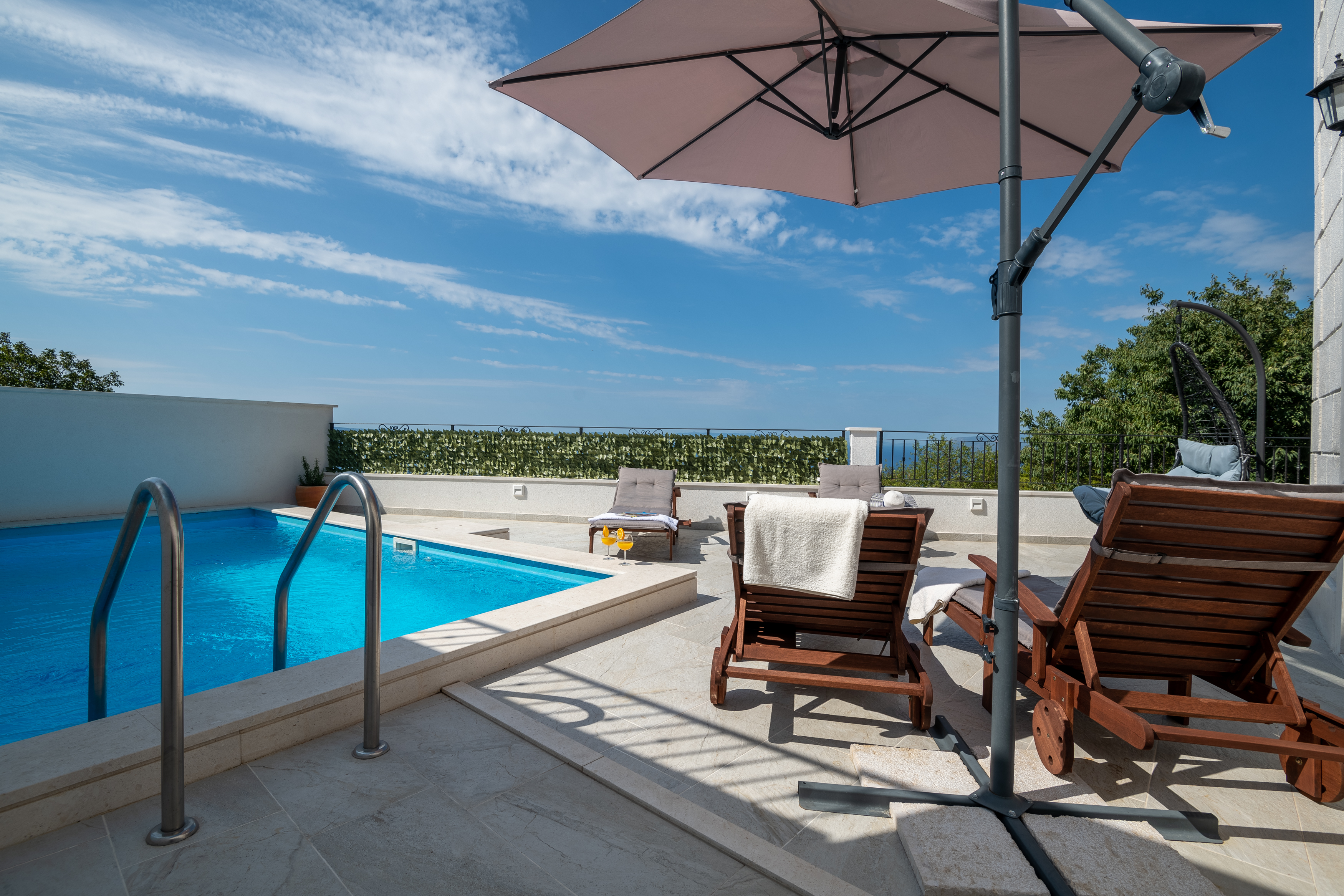 Outside is a big terrace with pool,sundebs and outside shower. There is also outside barbecue and big dining table.