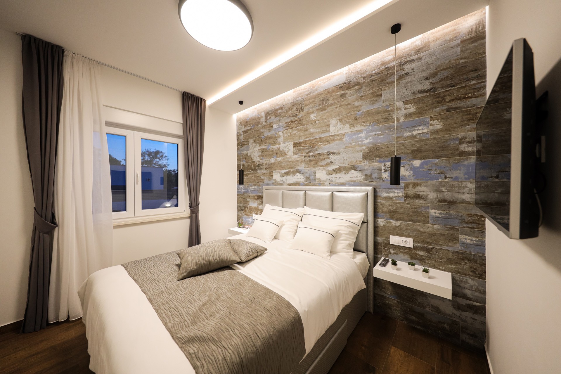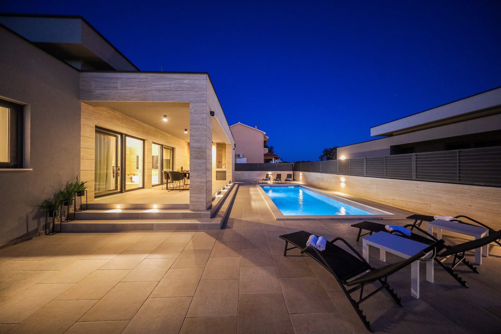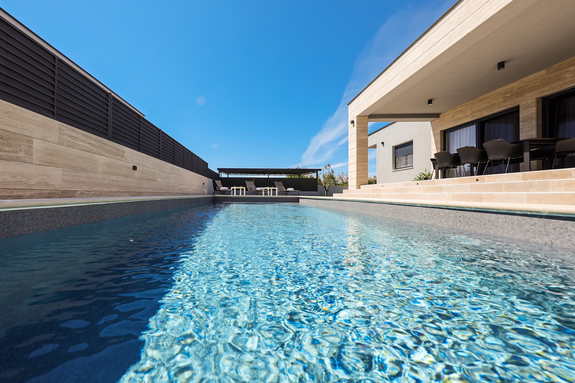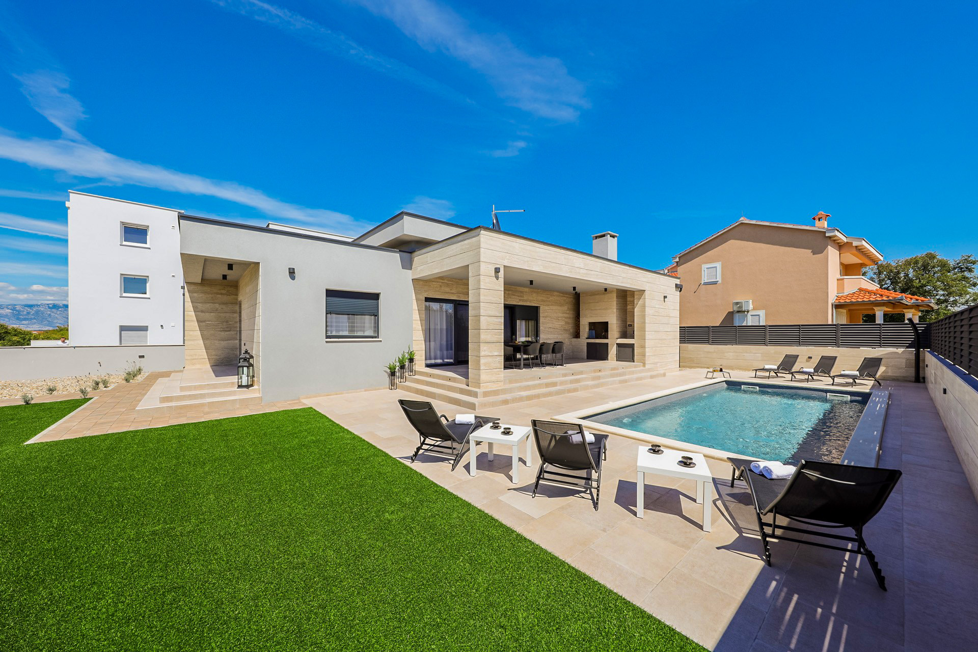 The modern newly built Villa Antonela has 4 luxury bedrooms with 2 singles and 3 double beds, and a sofa in the living room that can also serve as an extra bed for one person. (8 + 1) The villa has two modern and functional bathrooms with shower. In the garden there is a swimming pool with sun loungers which is fully fenced to ensure your privacy and peace. The youngest will enjoy playing in the pool, and are provided with mini goals for the pool and outdoor use, luftici and Play station.
